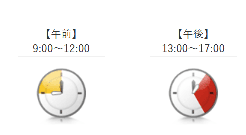 午前中(8時~12時) | 12時~14時 | 14時~16時 | 16時~18時 | 18時~20時 | 18時~21時 | 19時~21時 |