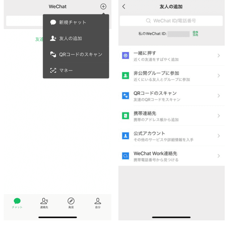 WeChat(微信)アプリのトップ画面、右上に「+」マーク(以下の左の画像を参照)がありますのでここをクリックします。